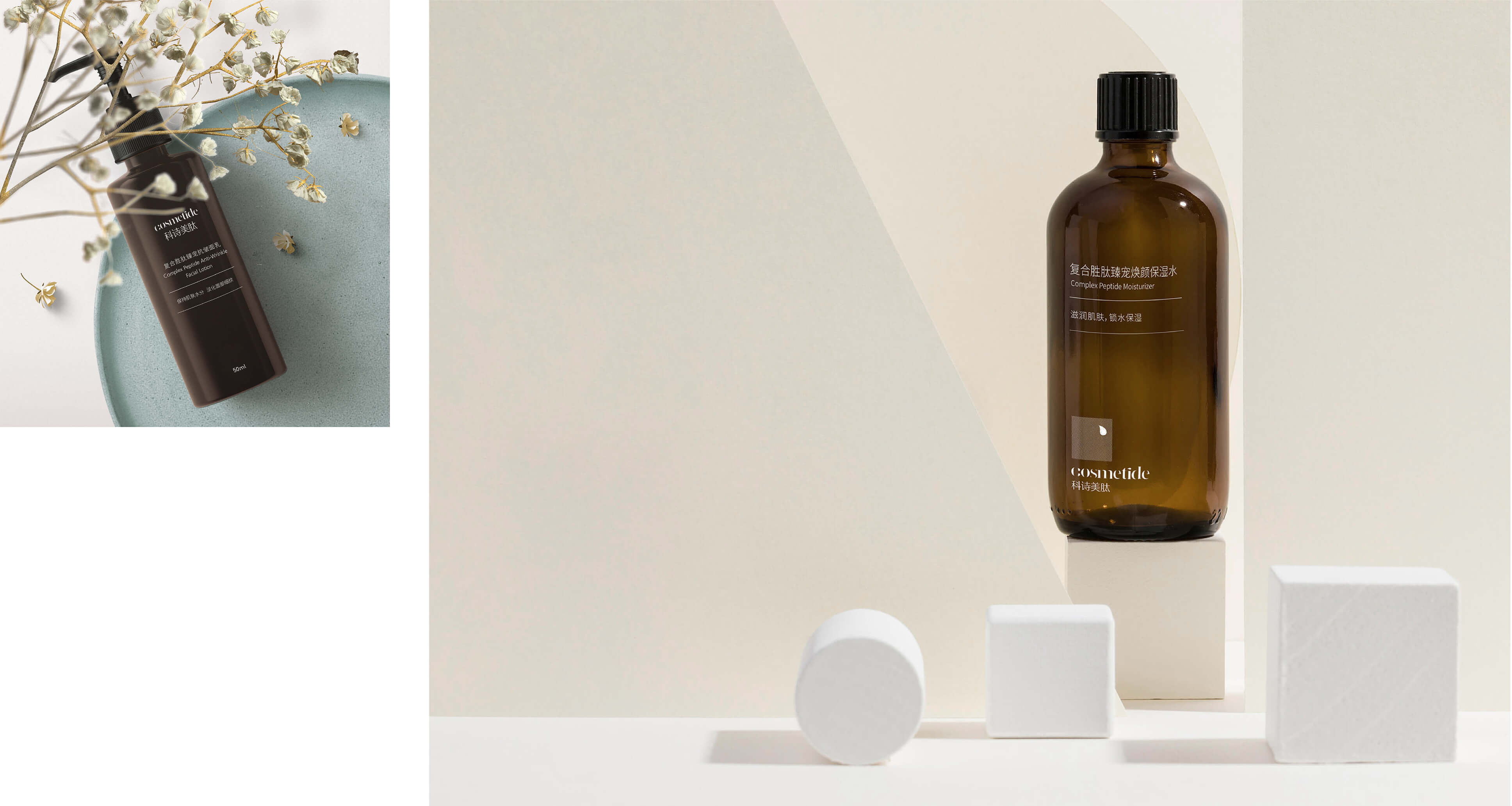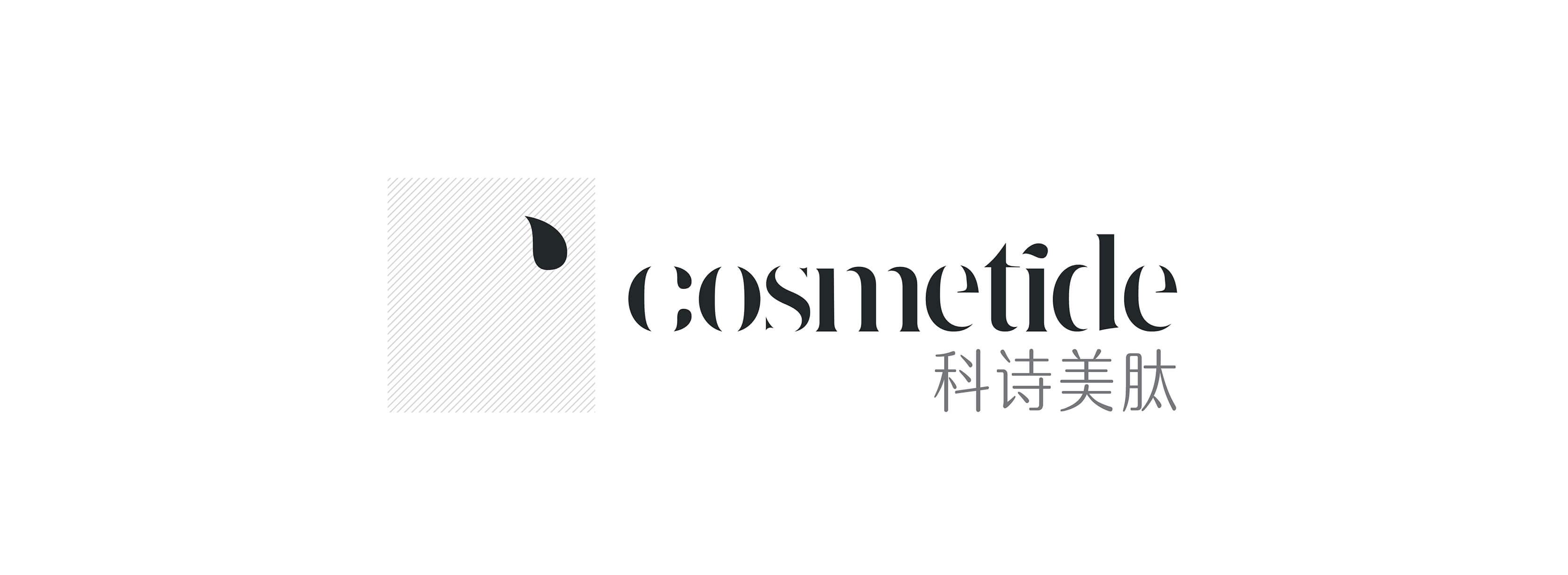 COSMETIDE 護膚品 負責此護膚品牌的VI和包裝設計,其中LOGO以删繁就简的减法美学,將字型“C”進行精髓簡化,僅保留 右上方如同液態形體的元素,與產品液態形體相呼應,並結合塊狀斜線建構出完整的面,讓整體視覺極簡純粹, 在意象上呈現出些許現代禪的東方感,以此體現出東方品牌的獨特性。