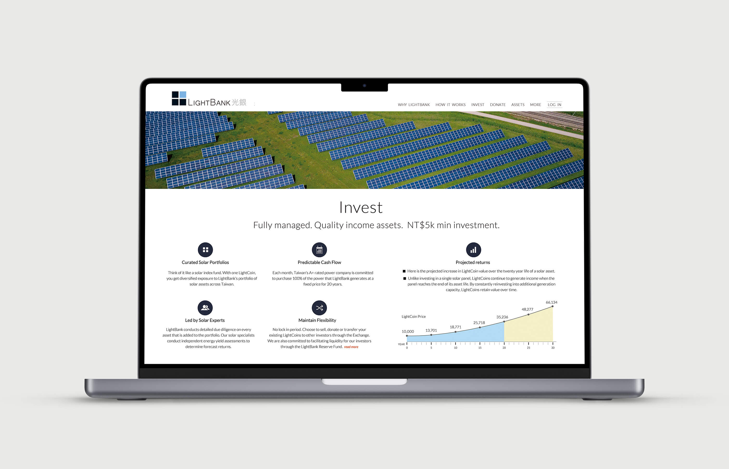LIGHT BANK LIGHT BANK是針對太陽能所推出虛擬貨幣的金融公司,我負責執行VI設計以及網站設計製作, 其中LOGO的部分,我運用4個矩形塊狀如同太陽能面板的外形概念,同時也具有貨幣的形體意象, 而其中3個黑色塊呈現出此企業名稱的第一個字母L。