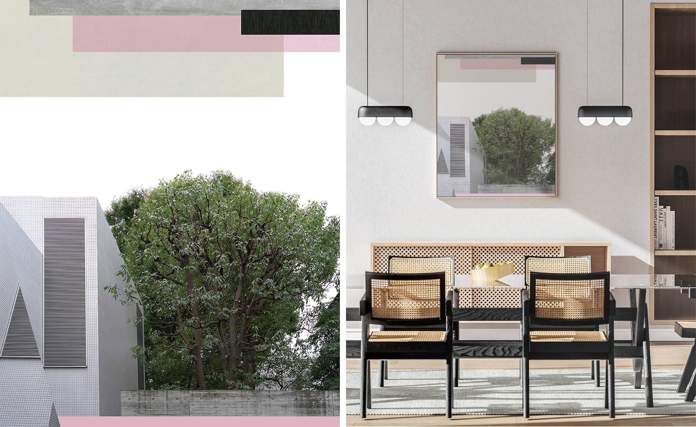 A lush tree stands alongside a minimalist building, while original imagery, geometric forms, and solid color blocks