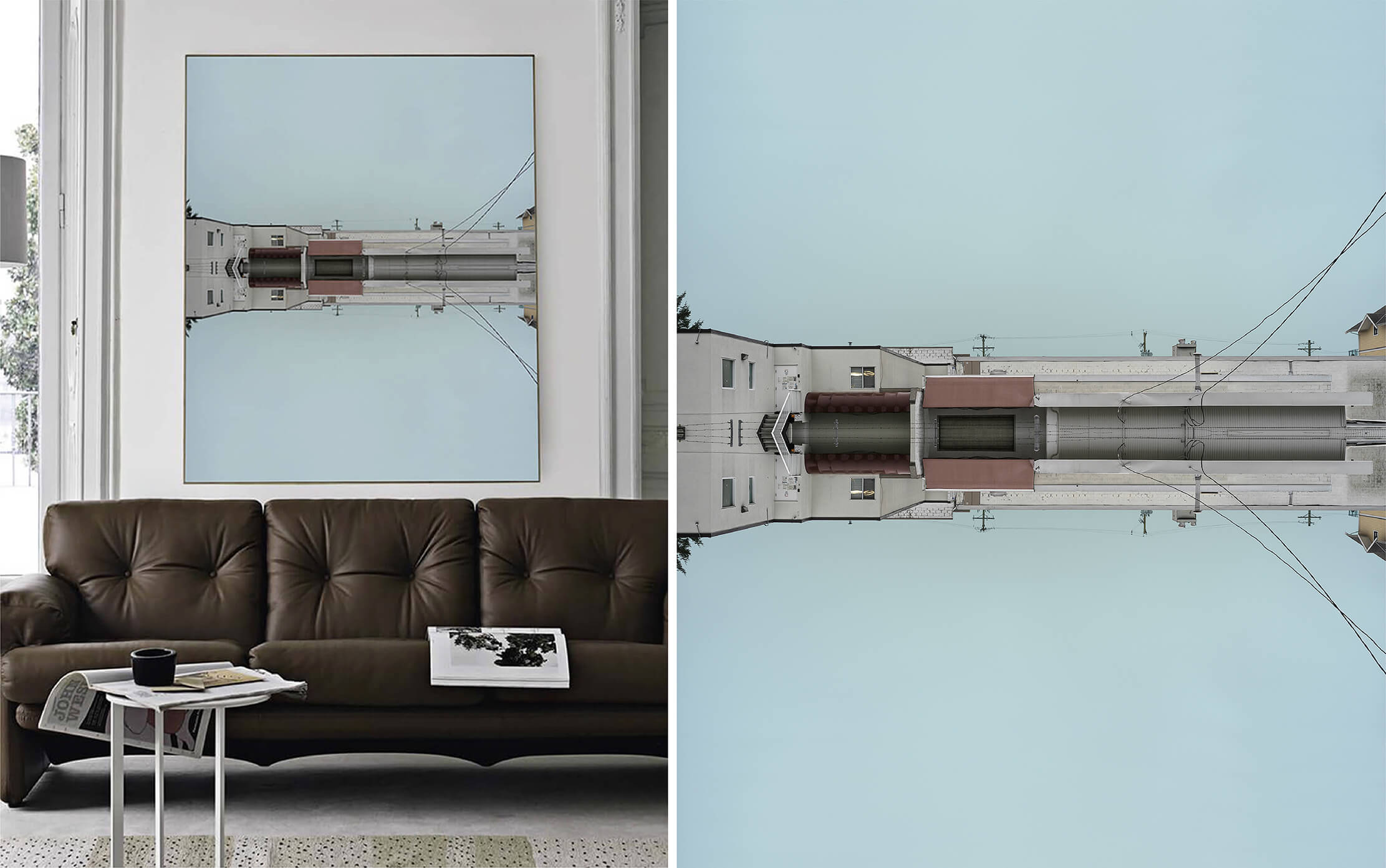 Through vertical mirroring, architecture is lifted beyond gravity and conventional logic, becoming a fragment